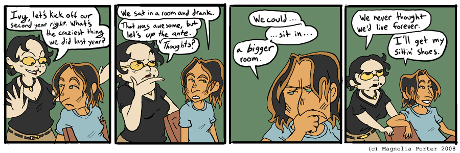 There is some romantic drama, but it’s also a very smart, funny strip about growing up and being in college. It was fun for me to read because I could relate to a lot of the characters’ experiences (dancing to a Peaches song, putting off work, having friends who play the ukulele). It also made me want to be more creative, and maybe I’ll spend some more time on my art.