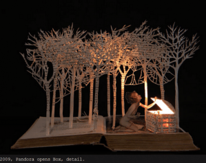 Su Blackwell does some really beautiful, mystical sculptures using books. Her work is a little more like fairy tales than Stilkey’s paintings of people and are somewhat like pop-up books.
